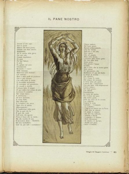 Una giovane contadina cammina in un campo di grano con spighe che le circondano il capo, a simboleggiare l’Italia, i frutti della terra italiana e del paziente e faticoso lavoro.