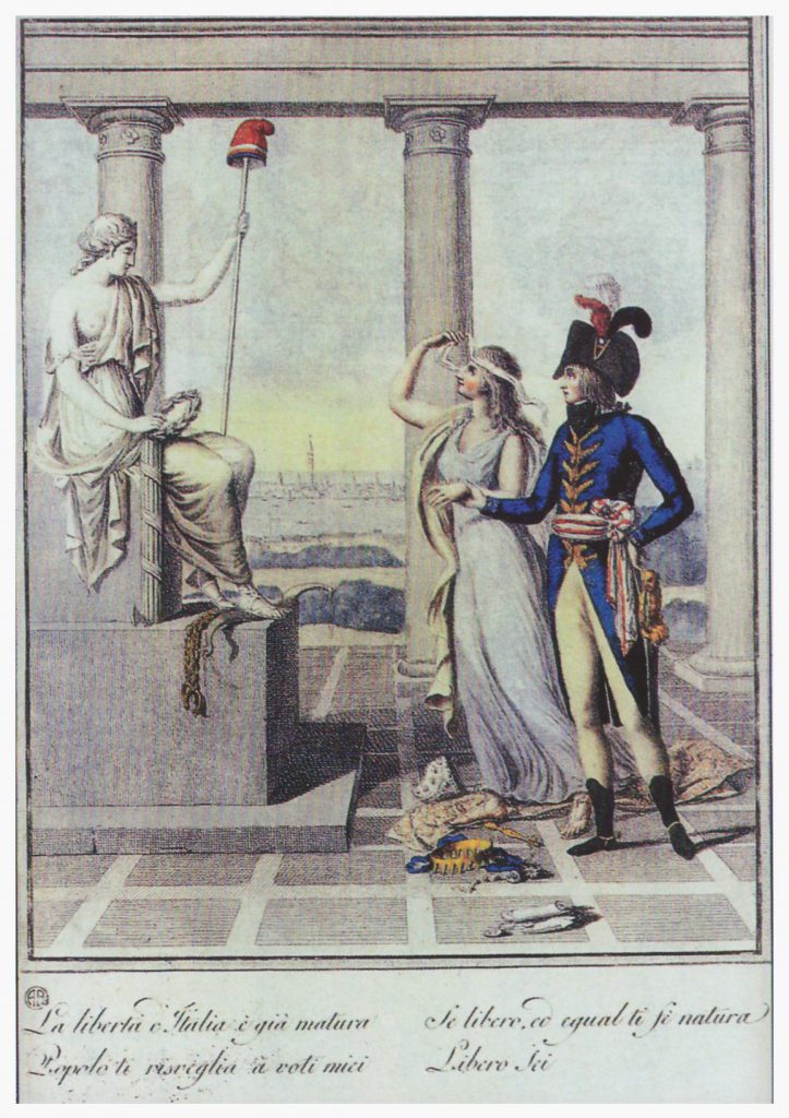 La figura femminile dell’Italia liberata (priva della benda che le copriva gli occhi) e vestita di bianco  è al braccio di Napoleone ed insieme riveriscono la Reppublica/Libertà francese. Questa è seduta su di un grande basamento e tiene nella mano sinistra una picca, sormontata dal berretto frigio.