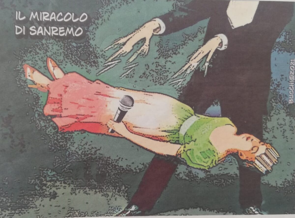 L’Italia turrita è in stato di trance e stringe nella mano sinistra un microfono. Un mago-prestigiatore la fa levitare in aria. Il riferimento è al festival di Sanremo.