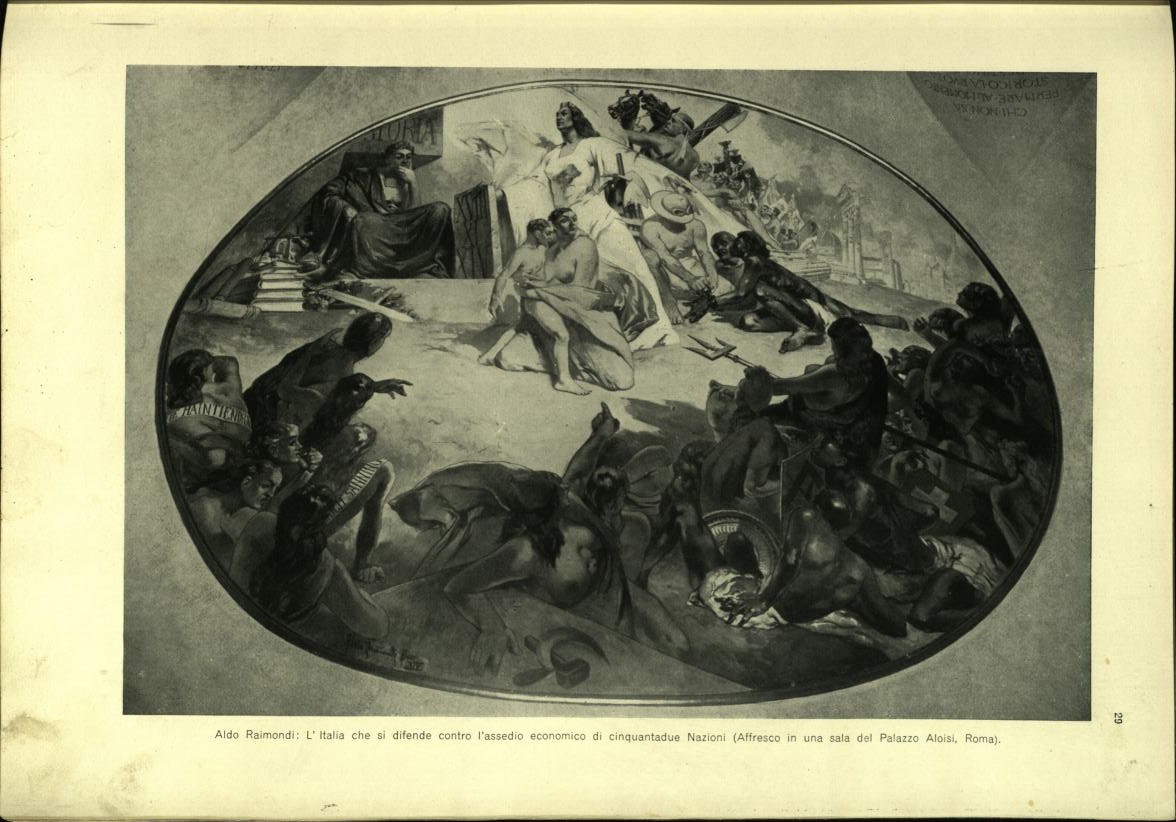 Nella rivista è riportata una foto di un affresco in cui è raffigurata l’Italia turrita vestita di bianco. Dietro di lei sembra essere presente, a sua difesa, Mussolini che imbraccia un fascio littorio. In calce: “Aldo Raimondi: l’Italia che si difende contro l’assedio economico di cinquantadue nazioni (Affresco in una sala di Palazzo Aloisi, Roma).