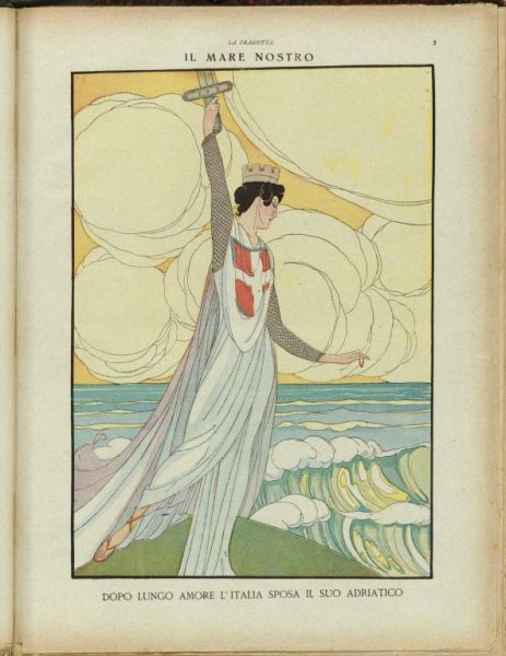 L’Italia turrita con scudo sabaudo sul petto e spada sguainata al cielo guarda il mare Adriatico, che bagna le sue terre. In calce: “Dopo lungo amore l’Italia sposa il suo Adriatico”.