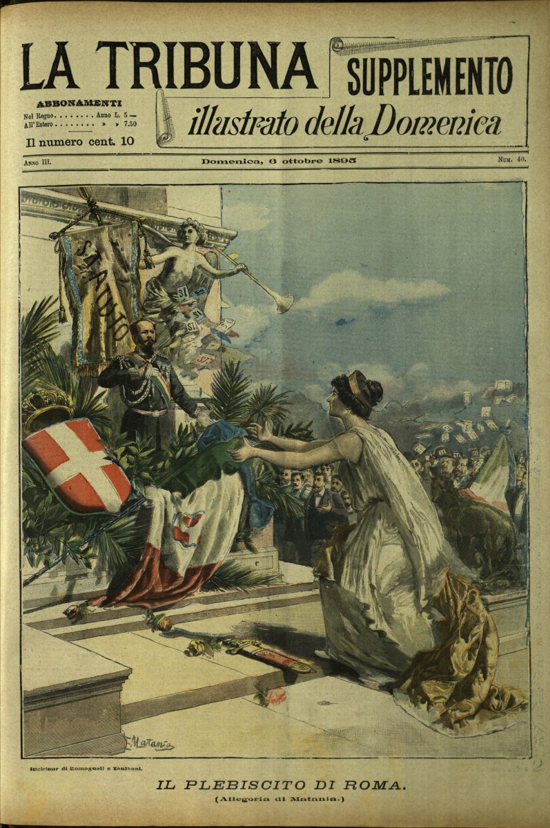 La copertina celebra il plebiscito che sancì l’annessione al Regno d’Italia di Roma, dopo la breccia di Porta Pia. In primo piano, Roma che si inginocchia davanti a Vittorio Emanuele II, allo Stato e al tricolore.