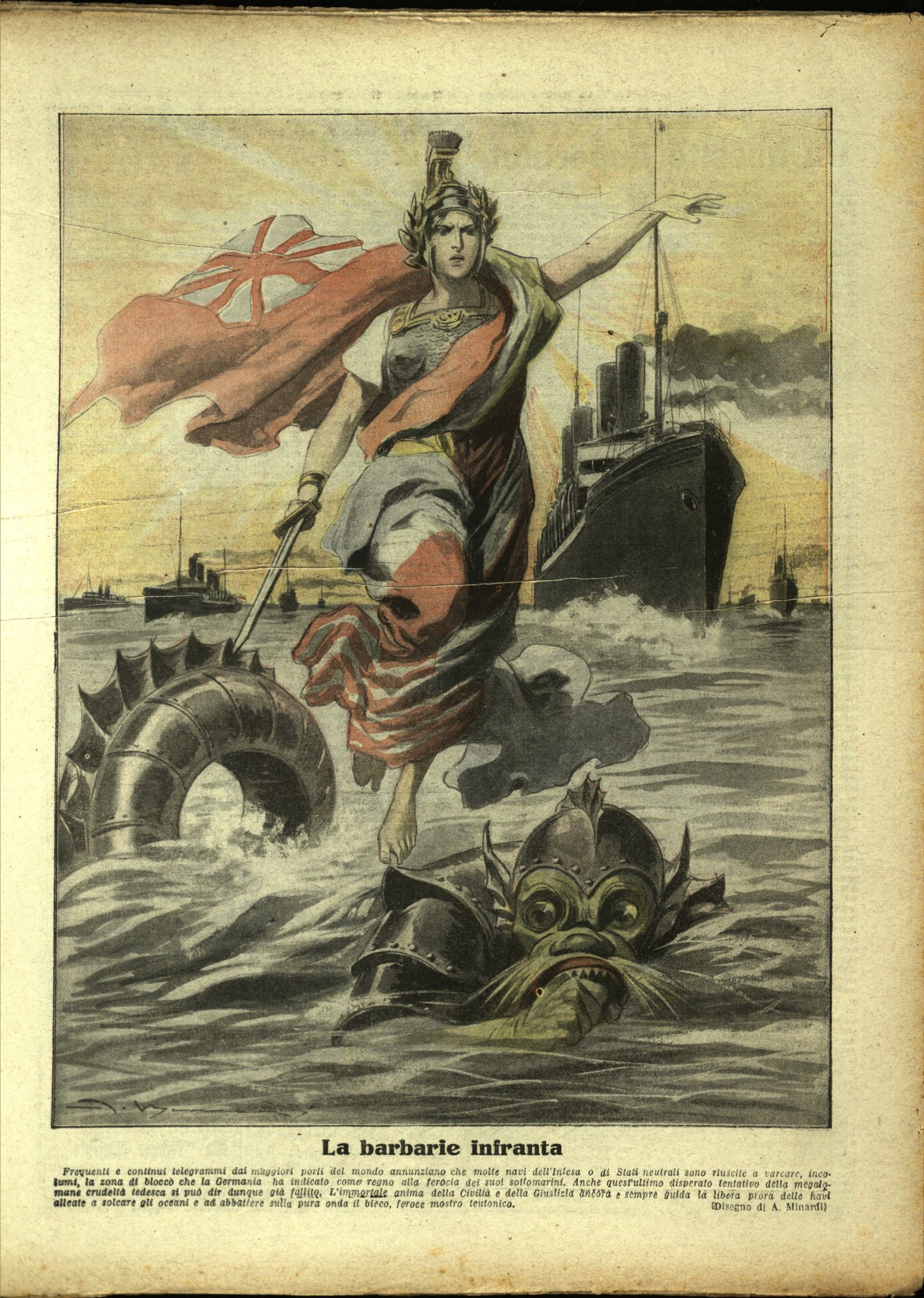 L’allegoria femminile dei paesi alleati contro la Germania durante il primo conflitto mondiale schiaccia un mostro marino, che rappresenta il comune nemico tedesco.