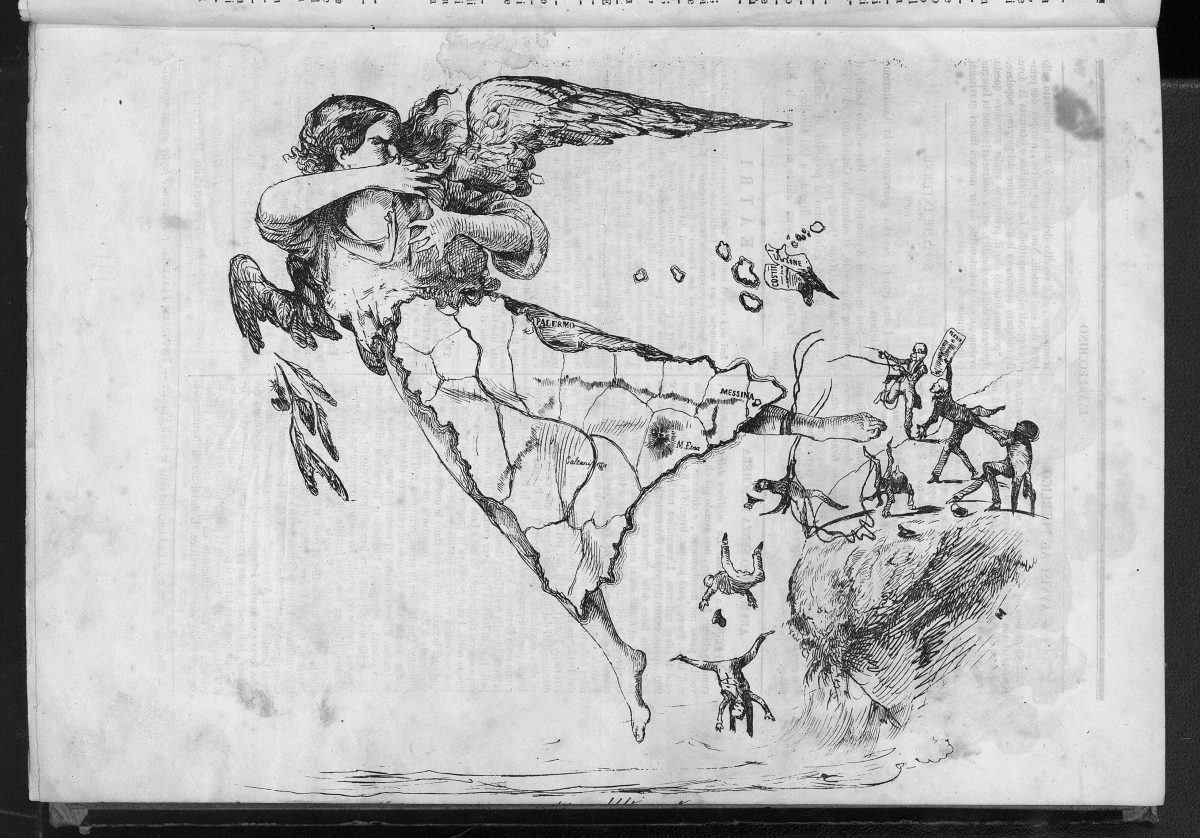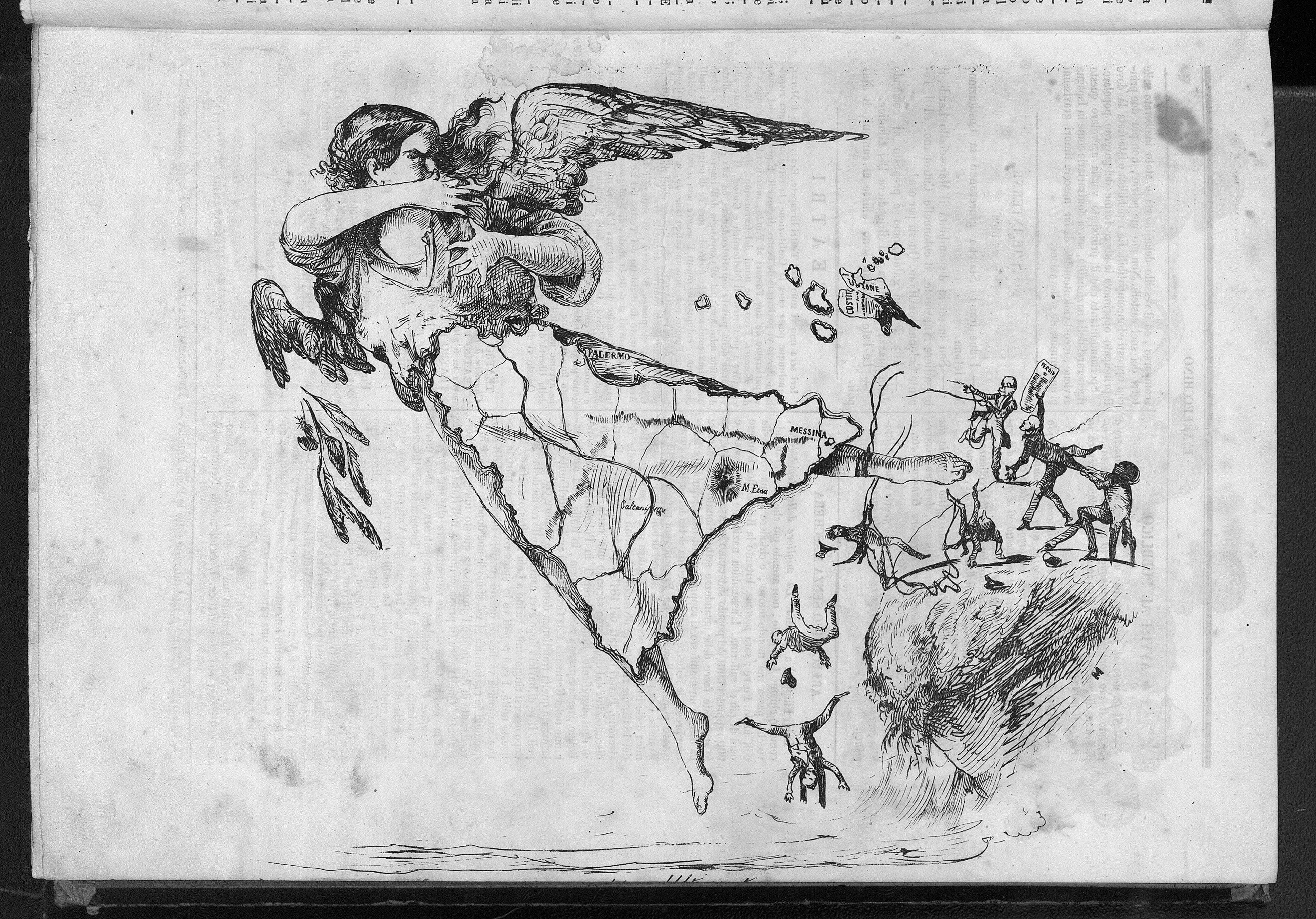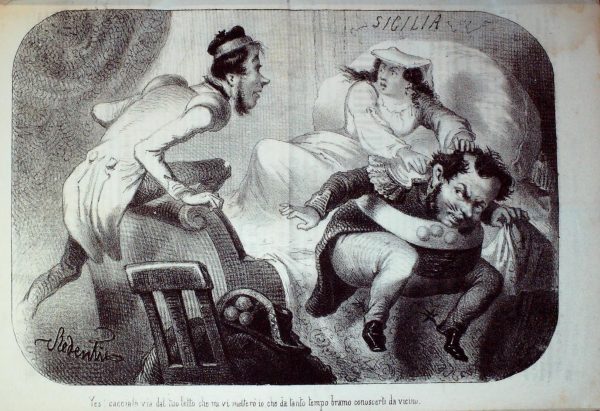 La Sicilia è rappresentata come un angelo beffardo che vola lontano dal Regno di Napoli. Alcuni personaggi tentano invano di fermarla, anche mostrando la costituzione appena concessa da Ferdinando II di Borbone.