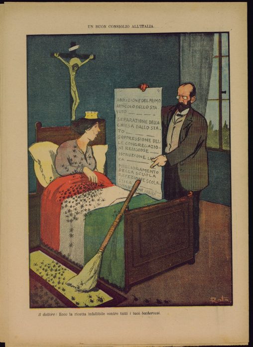 L’Italia turrita è ammalata a letto, perché infestata da parassiti. Un dottore le mostra la cura: “Abolizione del primo articolo dello Statuto; separazione della Chiesa dallo Stato; soppressione…