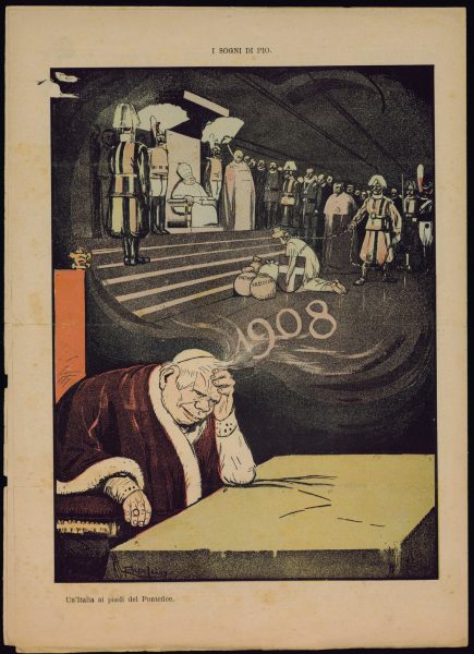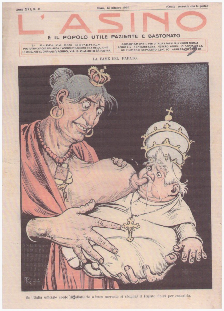 L’Italia turrita allatta Papa Pio X, che sembra non essere mai sazio. In calce: “Se l’Italia ufficiale crede di allattarlo a buon mercato si sbaglia. Il Papato finirà per esaurirla”.