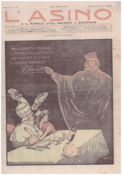 Pio X sogna per il 1908 un’Italia turrita in catene e inginocchiata al potere papale. In calce: “Un’Italia ai piedi del Pontefice”.