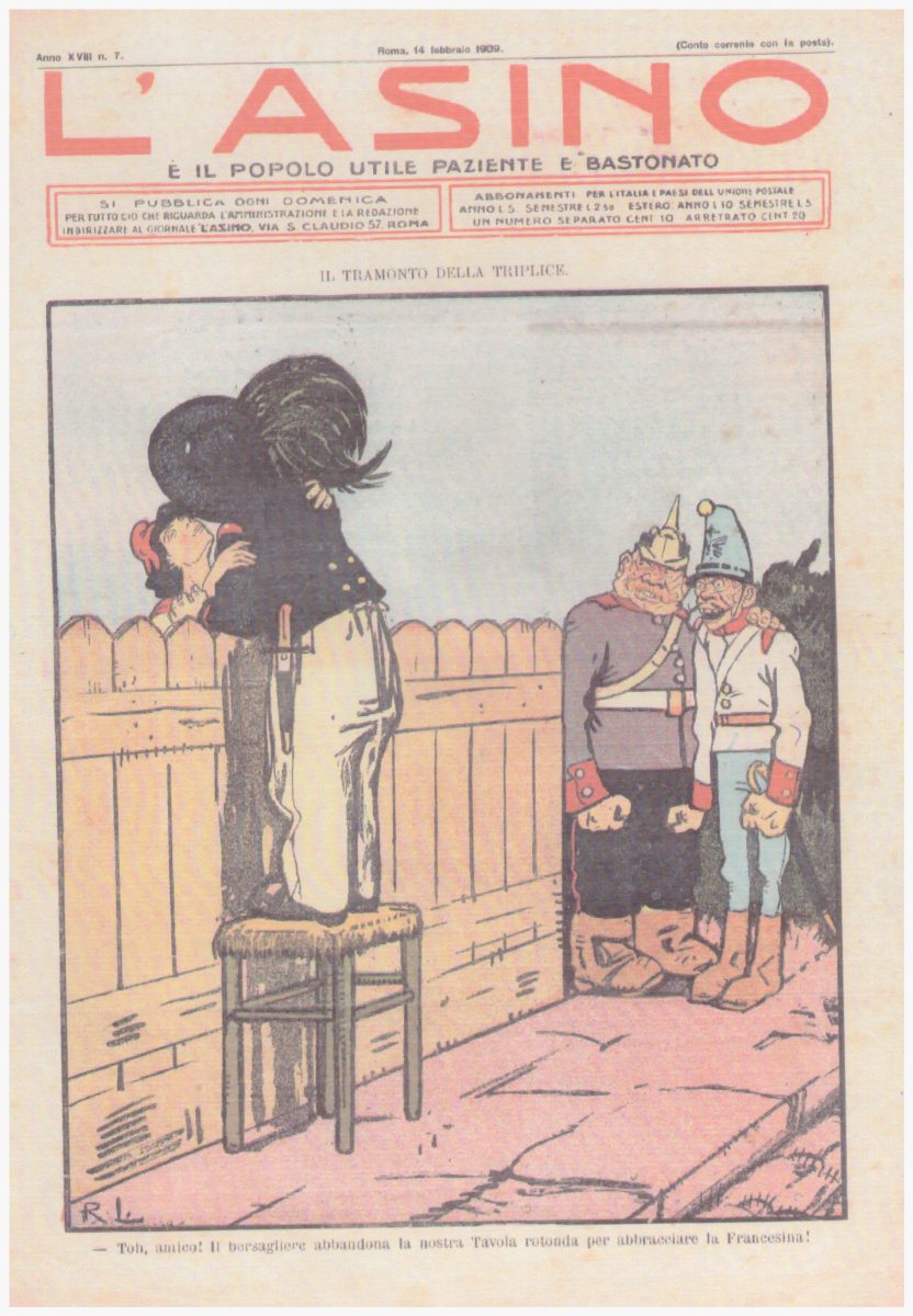 Un bersagliere è in procinto di baciare la Repubblica francese, la quale si trova appena al di là di una staccionata. In lontananza osservano la scena l’Austria-Ungheria e l’Impero tedesco.
