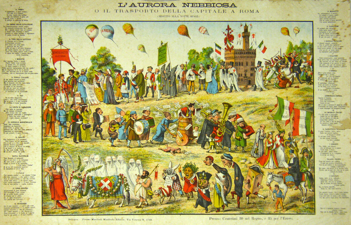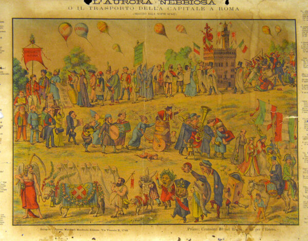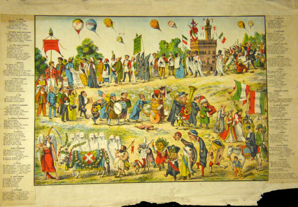 La tavola satirica mostra a destra (n. 11, nella didascalia a sinistra) l’Italia turrita, affatica dalla marcia, la quale indossa sulle spalle una bandiera con scudo sabaudo e trasporta una pesante crocifisso.