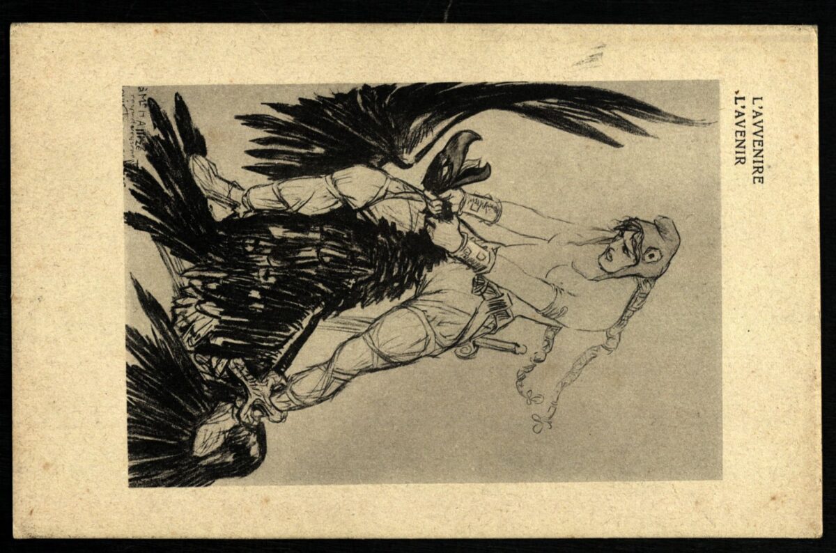 La figura femminile della Francia indossa il berretto frigio e prende violentemente per il collo l’aquila tedesca.