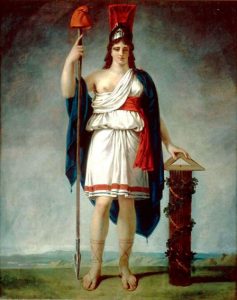 L’allegoria della libertà è rappresentata come una giovane donna, la quale indossa un abito giallo e porta sul capo il berretto frigio.  Appare vittoriosa ed evoca gli eventi delle Rivoluzione francese. Nella mano destra stringe il tricolore, mentre nella sinistra impugna la baionetta. La Libertà è circondata da figure di popolani, di borghesi, di soldati e di giovani.  Sullo sfondo si intravedono edifici della città e la cattedrale di Notre Dame.