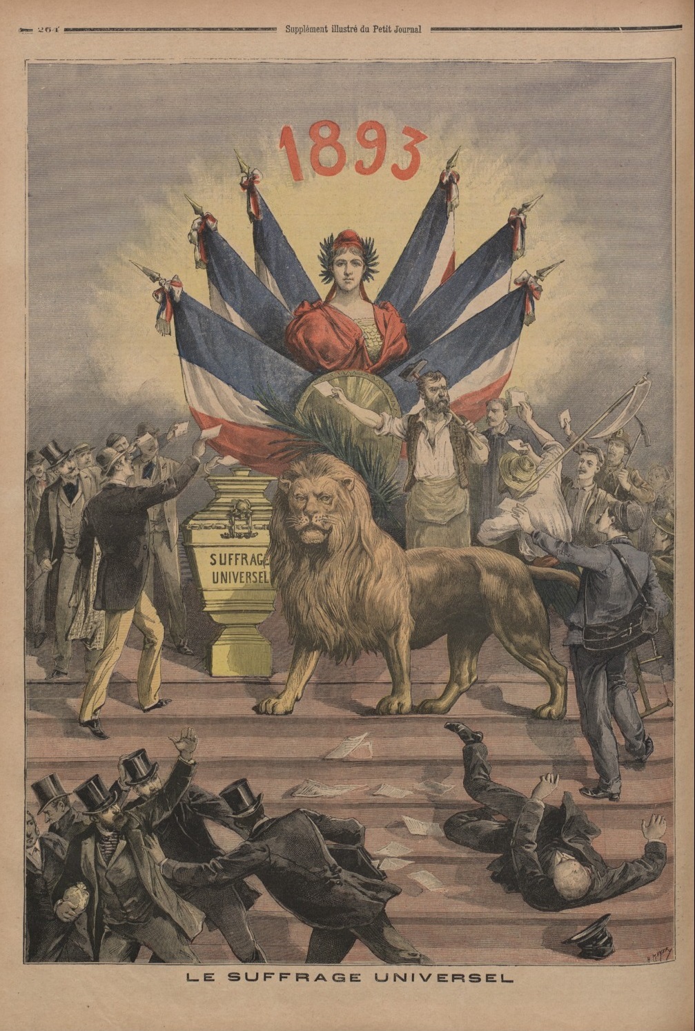Allegoria del suffragio universale. Al centro del disegno è presente un busto della Francia con cappello frigio e corona d’alloro.