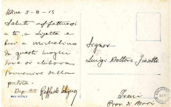 L’Italia turrita è seduta con nelle mani il tricolore e una corona d’alloro. Alle sue spalle sono appena sbarcati numerosi soldati italiani.