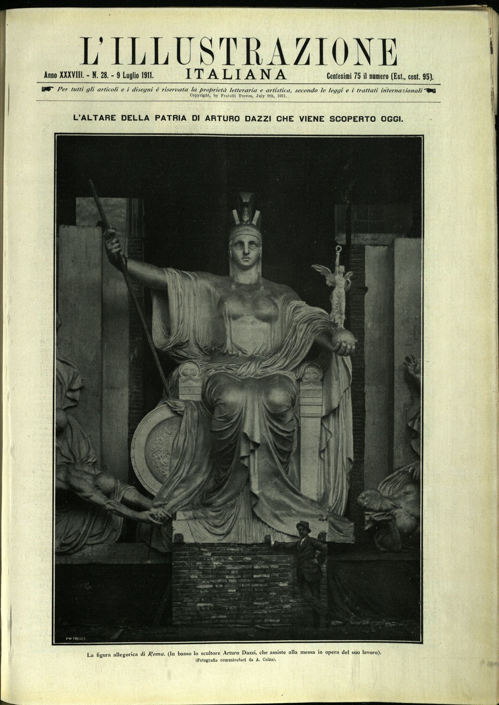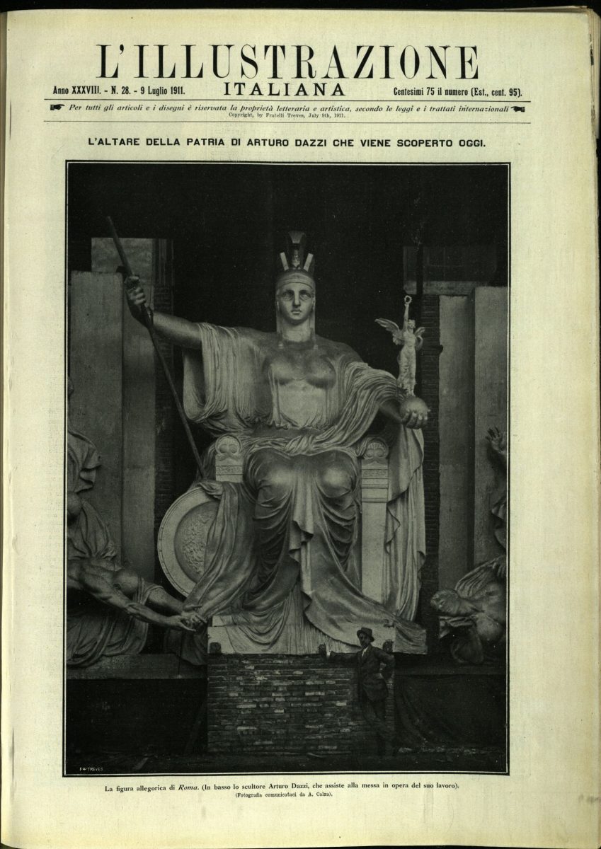 La copertina della rivista propone il modello in gesso, a grandezza naturale, del 1911, della statua della Dea Roma per il Vittoriano. L’opera non venne tradotta in marmo, perché venne preferita la versione di Angelo Zanelli.