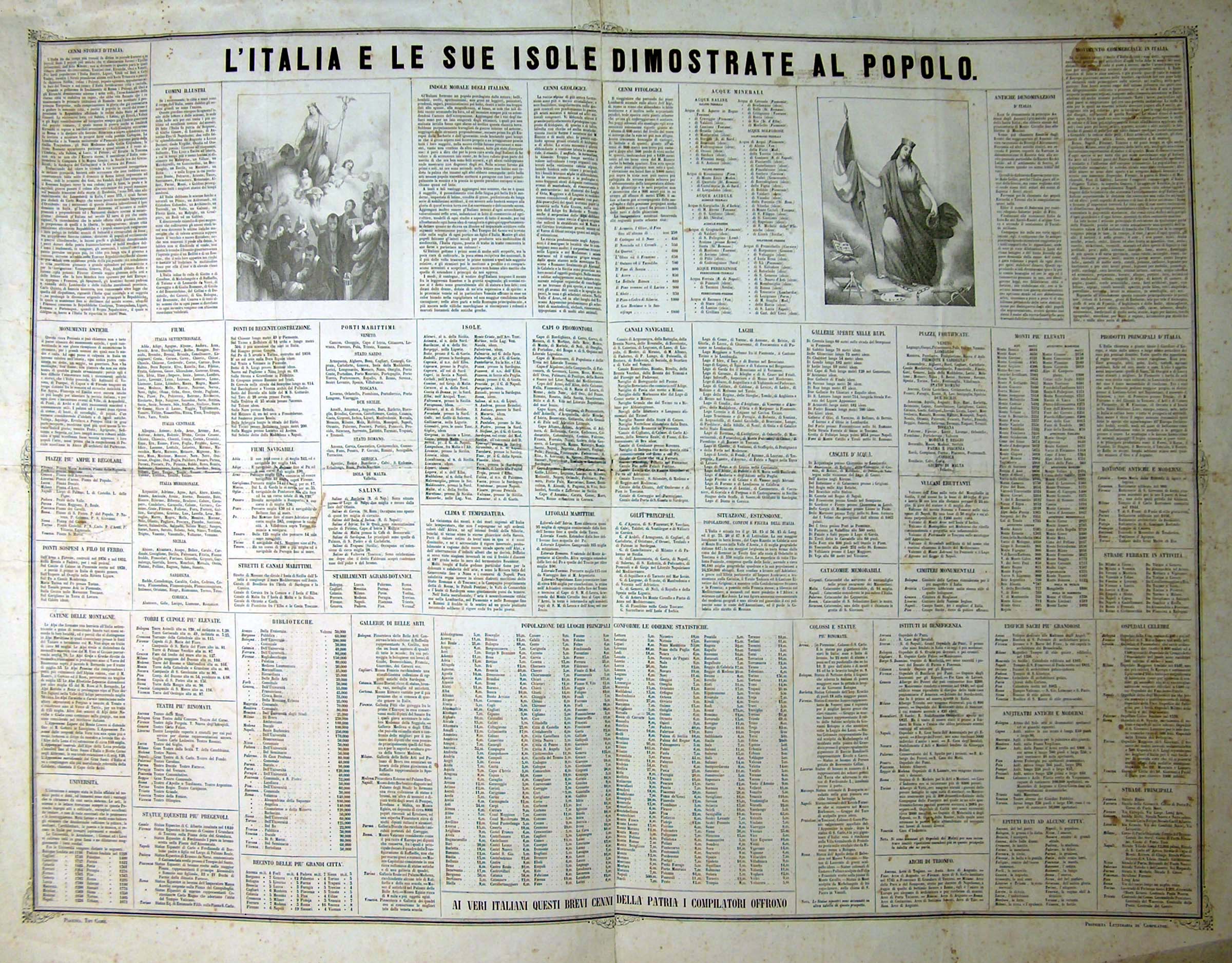 L’Italia turrita è raffigurata nei due riquadri (di sinistra e destra) del documento. Quest’ultimo presenta l’elenco dettagliato delle caratteristiche naturali del territorio della penisola (monti, fiumi, laghi, …) e l’elenco della infrastrutture costruite dall’uomo (ferrovie, ponti, porti,…) presenti sul suolo nazionale e sulle isole. Sono compresi anche alcuni cenni storici e il numero diabitanti delle città più importanti.