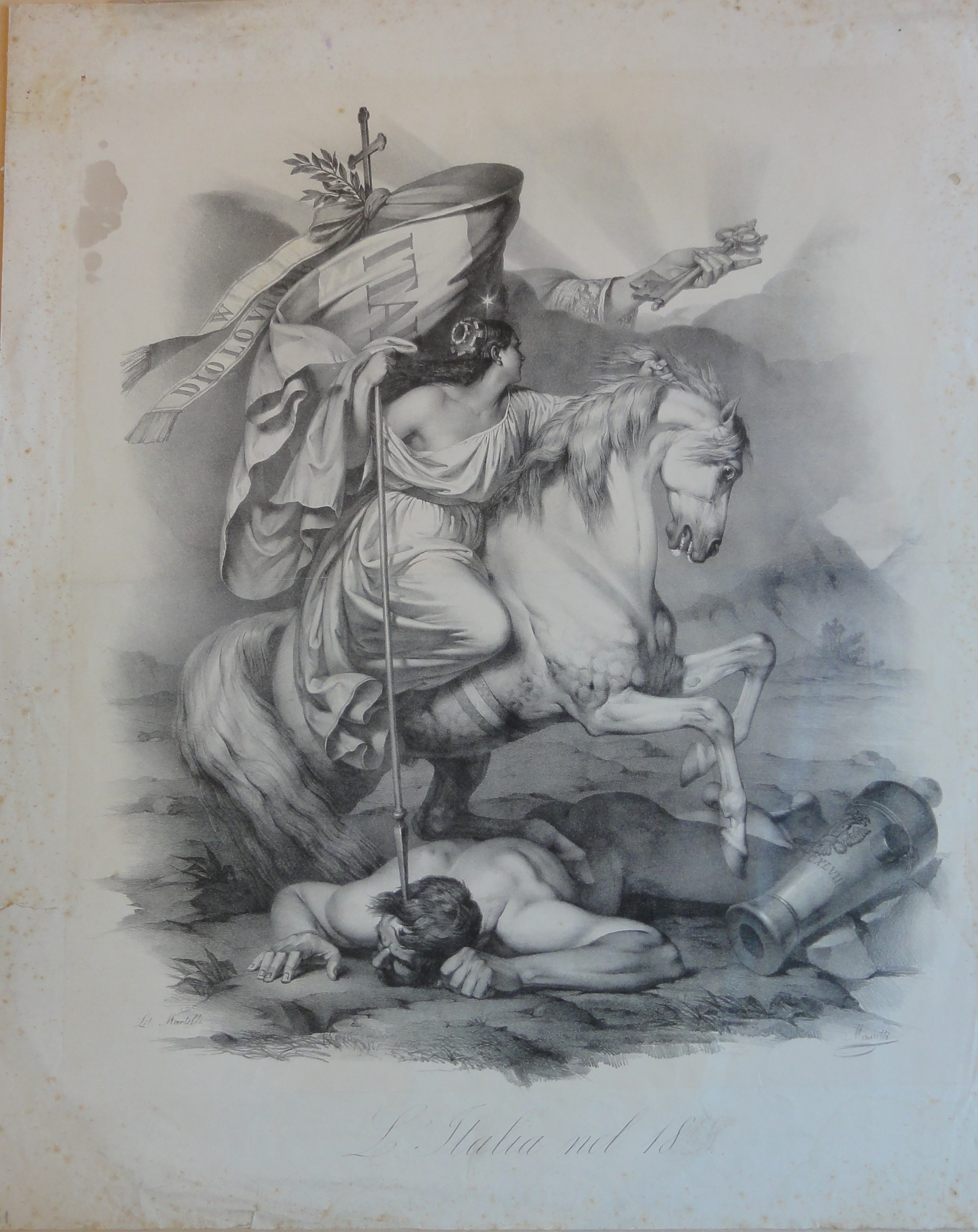 L’Italia turrita e stellata cavalca un possente cavallo bianco, stringendo nella mano destra il tricolore e colpendo con una lancia il Dispotismo. Sulla lancia sventola uno stendardo con scritto “Dio lo vuole”. Sullo sfondo una mano porge a Italia le chiavi di Pietro.