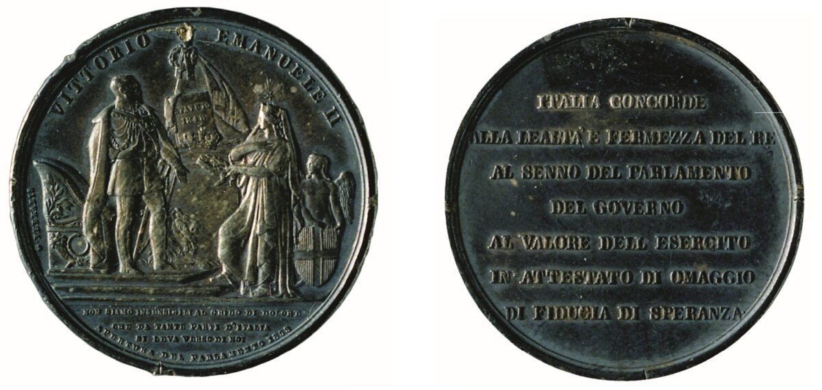 Sul dritto della medaglia Vittorio Emanuele II viene incoronato dalla personificazione dell’Italia, accompagnata da un angelo che sostiene uno scudo sabaudo. Medaglia realizzata a ricordo del discorso di apertura alle Camere del Re.