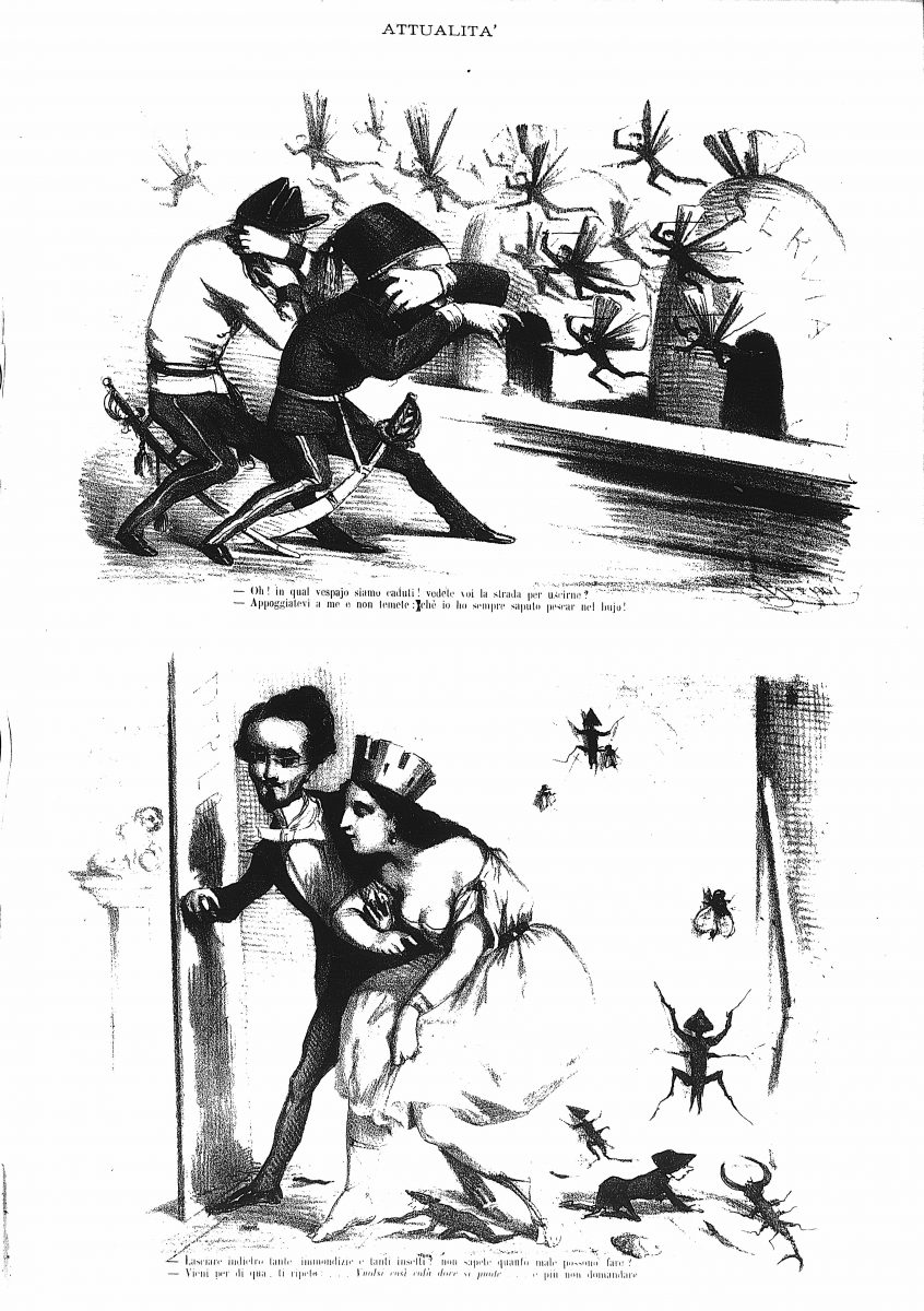 Serie di due vignette; nella seconda l’Italia turrita si appoggia a Ricasoli per sfuggire a dei fastidiosi insetti che infestano il Paese.