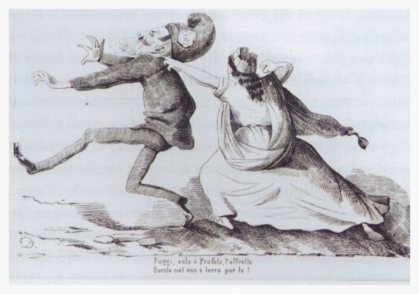 L’Italia turrita cerca di trattenere Garibaldi, il quale vuole prendere la mela che il serpente-Mazzini, avvolto intorno all’albero, gli porge. In calce: “No, no, per Dio! Non ceder del serpente ai lusinghieri inviti. È pomo di discordia il suo presente: E tu i miei figli dei volerli uniti”.