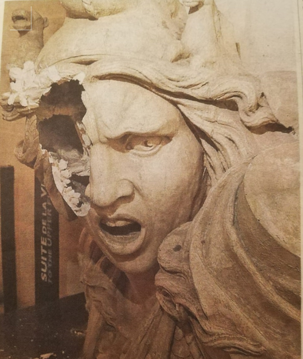 La statua di Marianne all’interno dell’Arco di Trionfo a Parigi, danneggiata negli scontri di dicembre tra forze dell’ordine e i “gilet gialli”, movimento di protesta sorto per l’aumento delle tasse sul gasolio e poi allargatosi fino a diventare una protesta contro il presidente Emmanuel Macron.