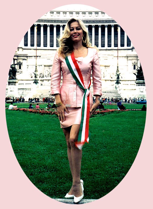 Moana Pozzi con fascia tricolore è di fronte all’Altare della Patria. L’immagine si riferisce alle elezioni amministrative del 1993, alle quali la Pozzi si candidò come sindaco di Roma.