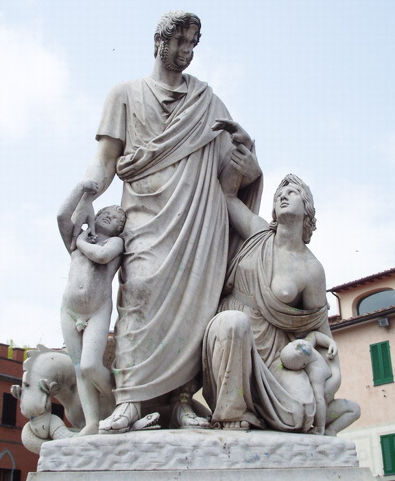Il gruppo scultoreo raffigura Leopoldo II di Lorena rivolto verso una donna, che tenta di sollevare da terra. Questa è l’allegoria femminile della Maremma, la quale ha in braccio un bambino morente (simbolo del futuro a cui la Maremma stessa sembra essere destinata). Leopoldo II calpesta inoltre un serpente (simbolo della malaria) e, sulla sinistra, protegge un bambino simbolo del cambiamento positivo che Leopoldo stesso ha dato alle terre maremmane.
