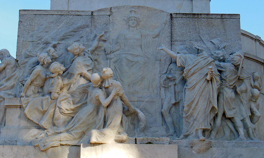 Nel monumento a Mazzini l’Italia turrita è rappresentata su uno dei bassorilievi del basamento. È ammantata in un peplo e verso di lei convergono gli eroi del Risorgimento.