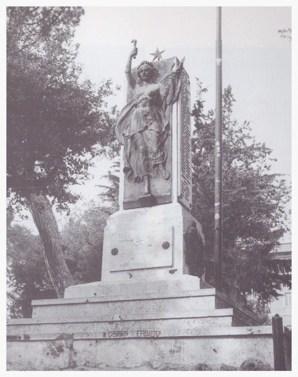 Sul fronte del monumento è apposto un rilievo in bronzo, raffigurante una figura femminile, allegoria della Patria, con il capo cinto d’alloro, il seno scoperto e vestita da una tunica retta in vita da una cintura fermata da una testa di leone. Sulla sommità del cippo è posto lo stellone d’Italia.