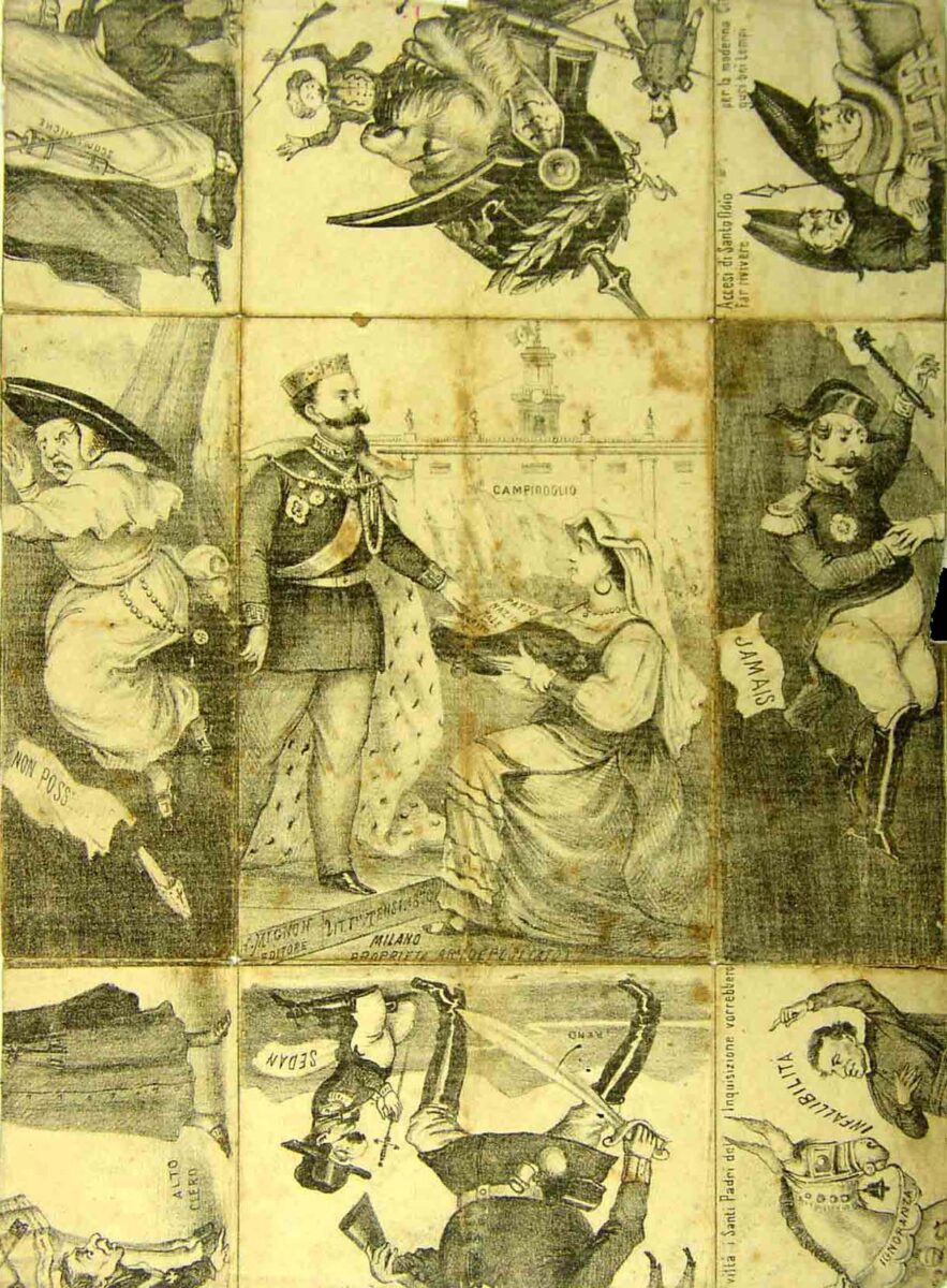 Al centro dell’incisione è rappresentato Vittorio Emanuele II. Di fronte al sovrano è presente la figura femminile della città di Roma in abiti tradizionali ciociari.