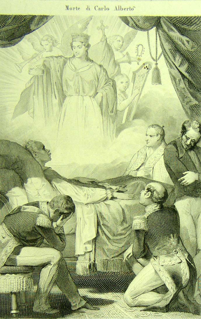 L’Italia turrita posa sul capo di Carlo Alberto morente una corona.