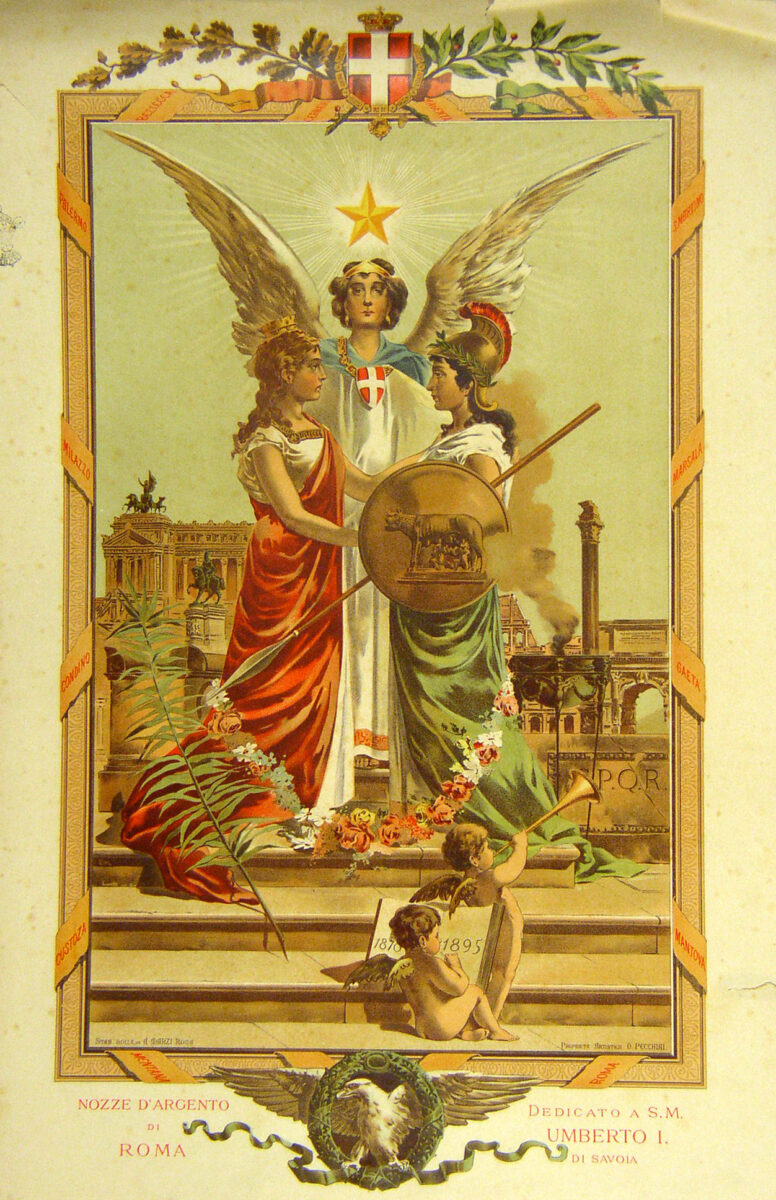 L’Italia turrita (a sinistra) e Roma (a destra) con elmo, scudo e lancia si stringono la mano. Tra le due figure femminili, l’allegoria della Vittoria. Sullo sfondo il Vittoriano e i fori imperiali. Sulla cornice sono riportati alcuni luoghi fondamentali dell’Unità italiana. In calce dedica a Umberto I.