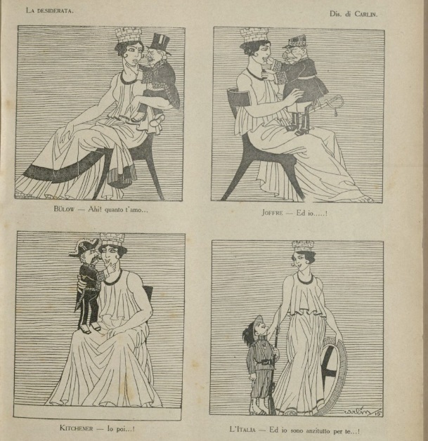 L’Italia turrita è corteggiata da von Bülow, da Joffre, da Kitchener , ma ha occhi solo per i bersaglieri italiani.