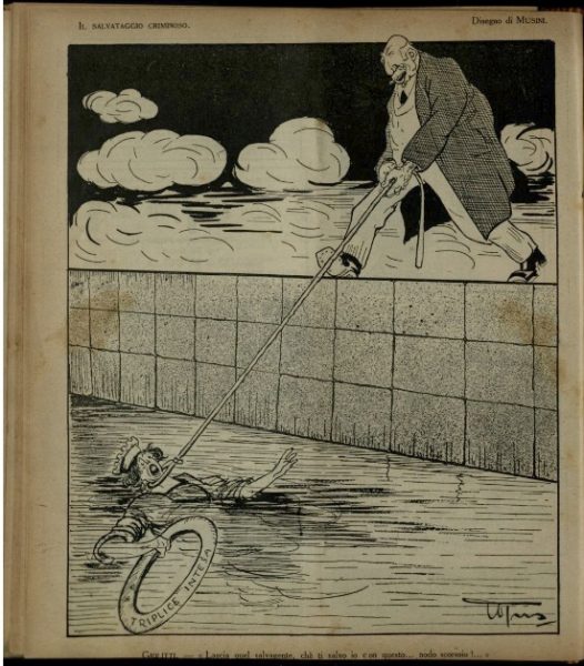 L’Italia turrita in lutto siede sulla lapide della Triplice Alleanza. Una mano le offre dei fiori della Triplice intesa. In calce: “-Ora che sono trascorsi i mesi formali di vedovanza, spero di poter finalmente convolare a nozze….”.