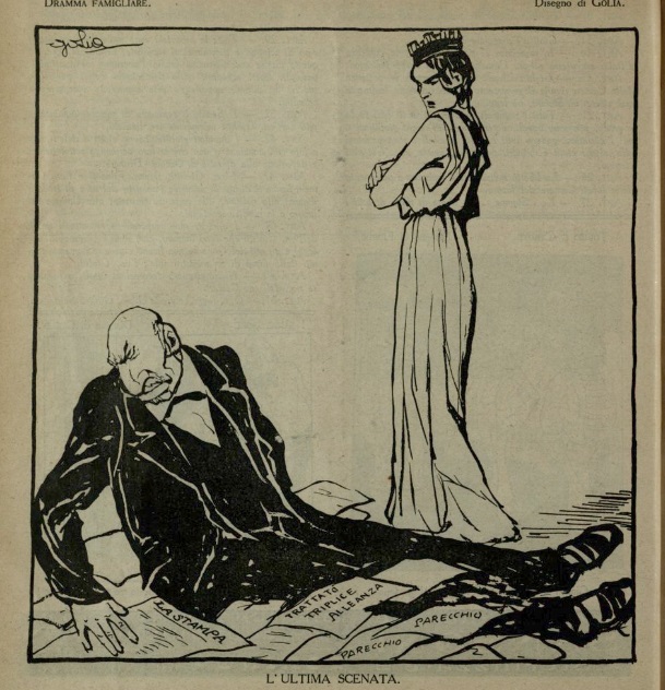 L’Italia turrita è incollerita con Giovanni Giolitti; quest’ultimo è a terra tra fogli di carta e giornali: “trattato triplice alleanza”, “La Stampa”….