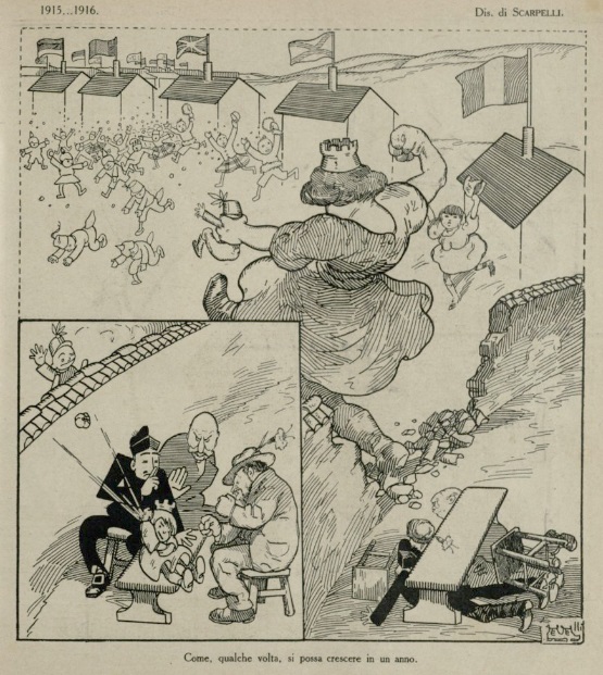 Da un anno (1915) all’altro (1916) l’Italia turrita è cresciuta. È entrata in guerra. In calce: “Come, qualche volta, si possa crescere in un anno”.