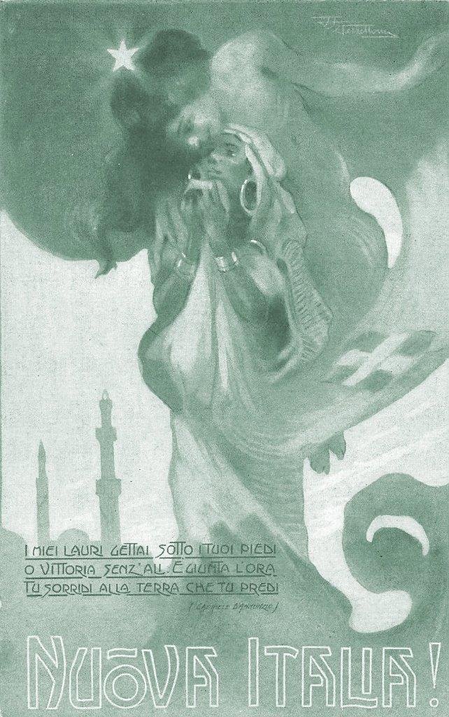 L’Italia stellata e con i capelli sciolti è rappresentata nell’atto di abbracciare una giovane donna araba, allegoria delle terre nordafricane ottomane (Tripolitania e Cirenaica) conquistate durante la guerra italo-turca o guerra di Libia. A sinistra sono riportati i versi di Gabriele d’Annunzio: “I mie lauri gettai sotto i tuoi piedi / O Vittoria senz’ali. E giunta l’ora. / Tu sorridi alla terra che tu predi”.