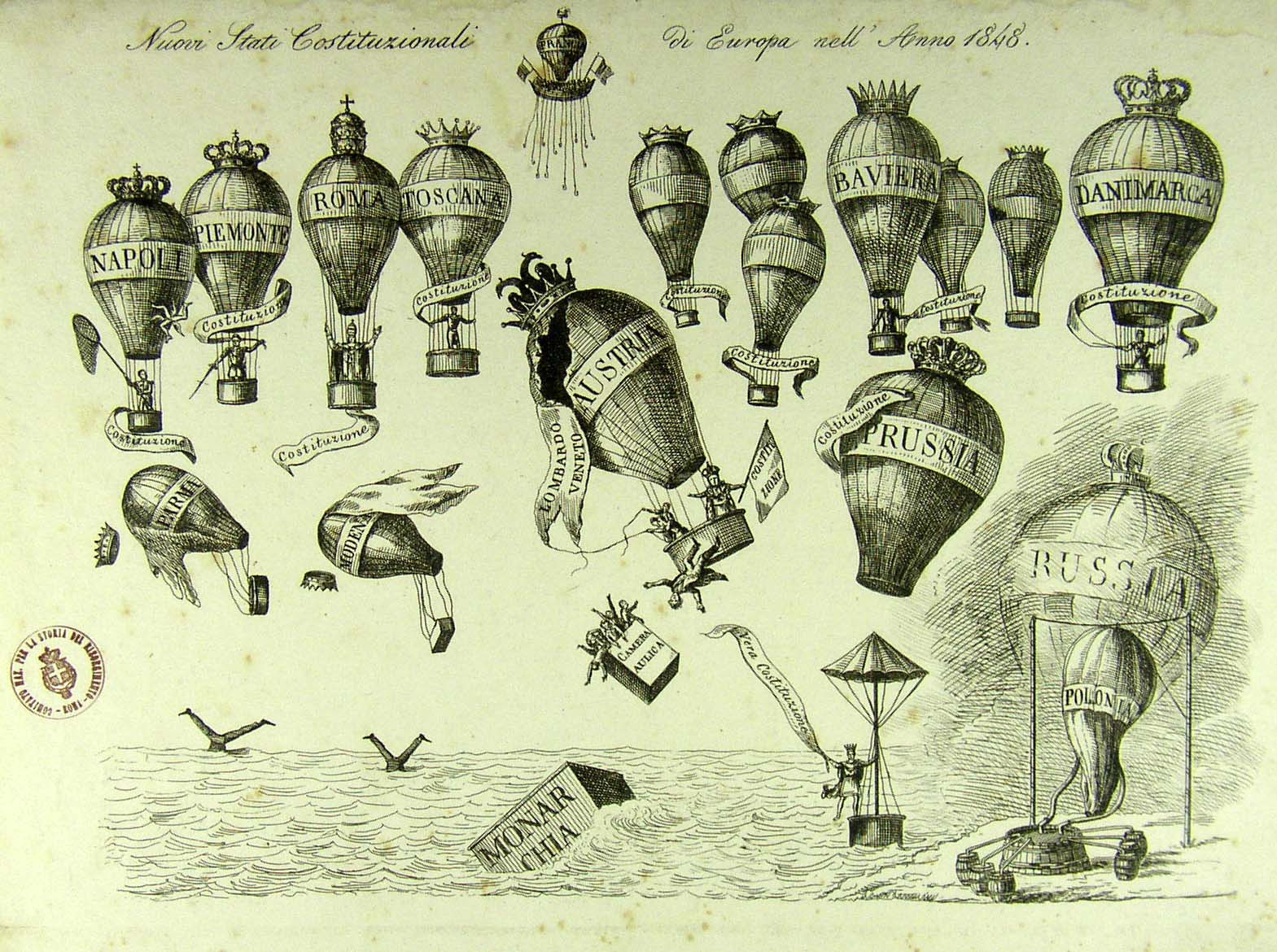 Le mongolfiere dei diversi Stati si alzano in volo con i loro governanti e i simboli del potere. La Monarchia assoluta affonda mentre anche la Polonia sta preparandosi al volo. In alto, la mongolfiera francese ha gettato numerosi ami per afferrare le altre mongolfiere. La mongolfiera dell’Austria-Lombardo Veneto è gravemente danneggiata. In basso a destra, una figura femminile con corona sul capo sventola lo stendendardo della “Vera Costituzione”.
