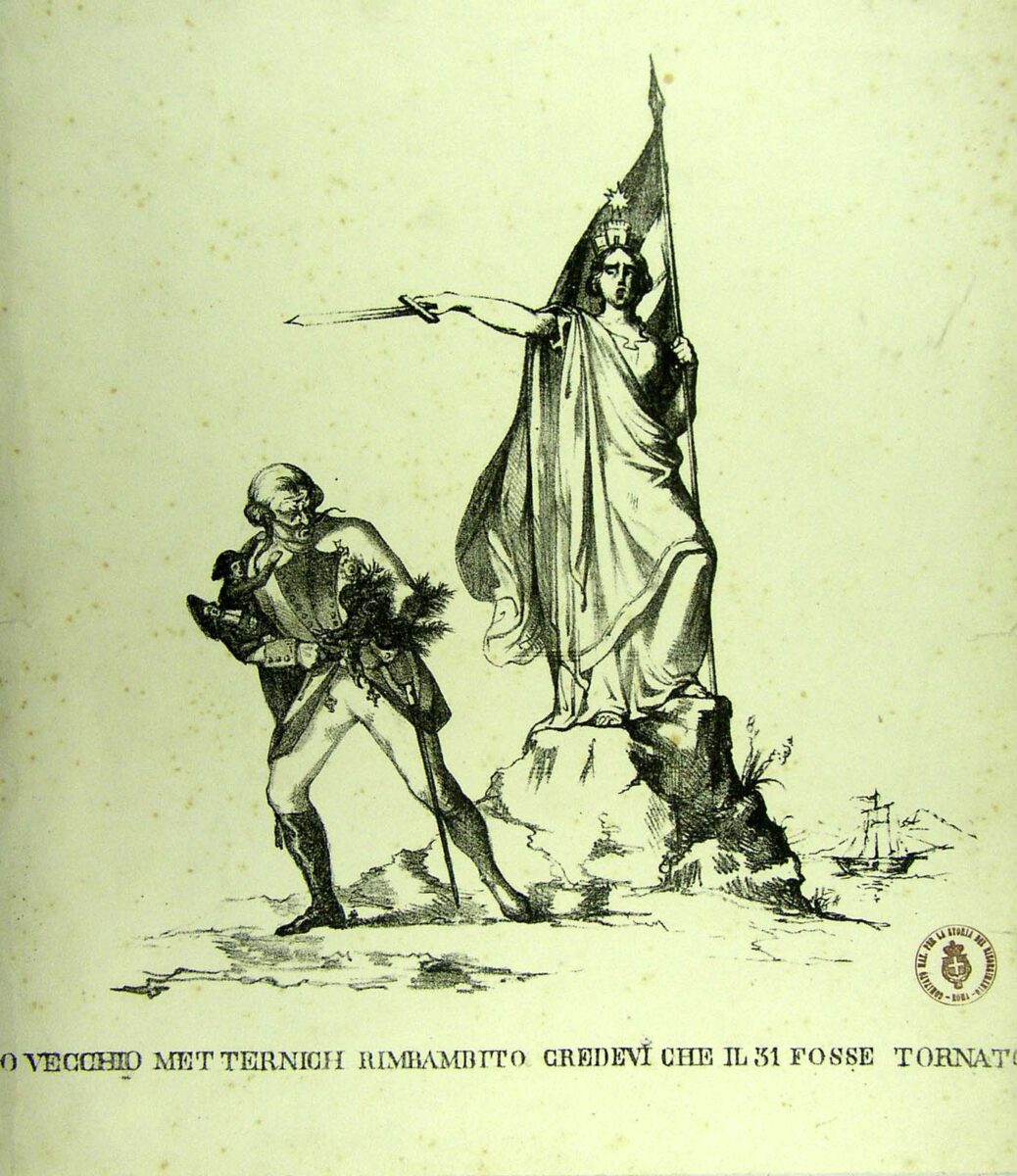 L’Italia turrita e stellata con la spada sguainita nella mano destra e la bandiera italiana nell’altra, si rivolge furibonda a Metternich, il quale tiene sottobraccio dei gesuiti e l’aquila bicipite austriaca nell’altra, mentre si allontana senza uno stivale. Sullo sfondo a destra una barca.