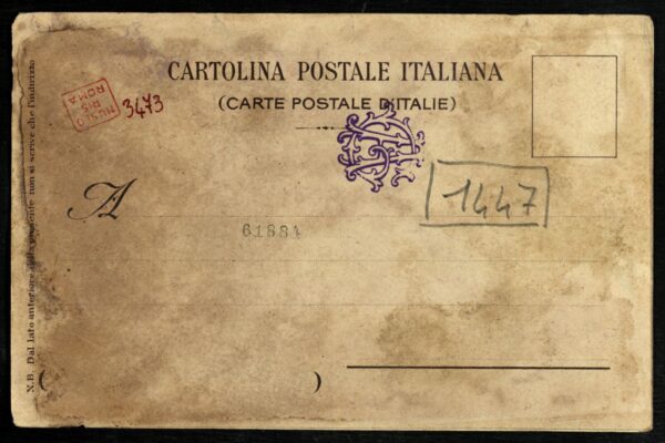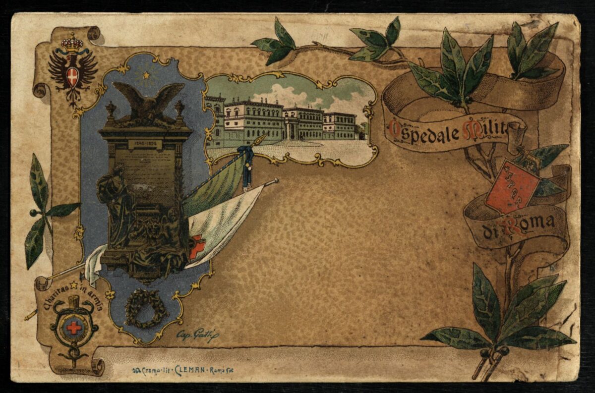 Sulla sinistra è rappresentata una lapide commemorativa in cui è presente l’Italia turrita. Sullo sfondo è raffigurata una veduta dell’ospedale militare Roma.