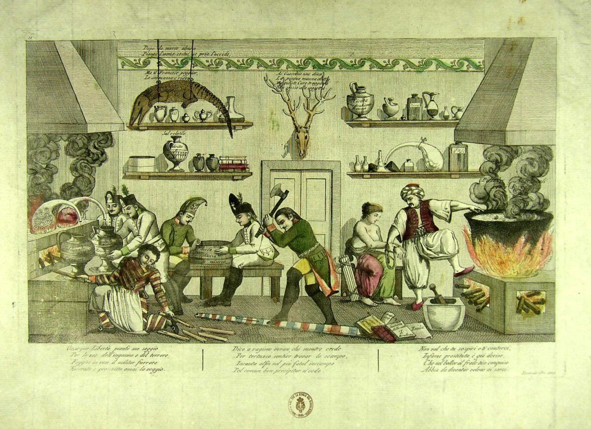 Allegoria satirica, in cui le Potenze della seconda coalizione antifrancese fanno a pezzi i prodotti di un laboratorio alchemico repubblicano. A sinistra soldati austriaci prendono il distillato di un berretto frigio e di coccarde tricolori, mentre dalla parte opposta della stanza un turco indica un calderone alla Repubblica francese/Democrazia, semi nuda, in cui si trasformerà in “veleno ai sorci”. A terra un palo tricolore e i libri di Rousseau e Mirabeau, utilizzati come combustibile.