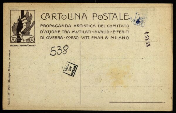 Due figure femminili, probabilmente madre e figlia, rappresentano l’Italia e il sacrifico che la Patria è disposta a dare per raggiungere la vittoria. Sul retro della cartolina: Propaganda artistica del comitato d’azione tra mutilati, invalidi e feriti di guerra.