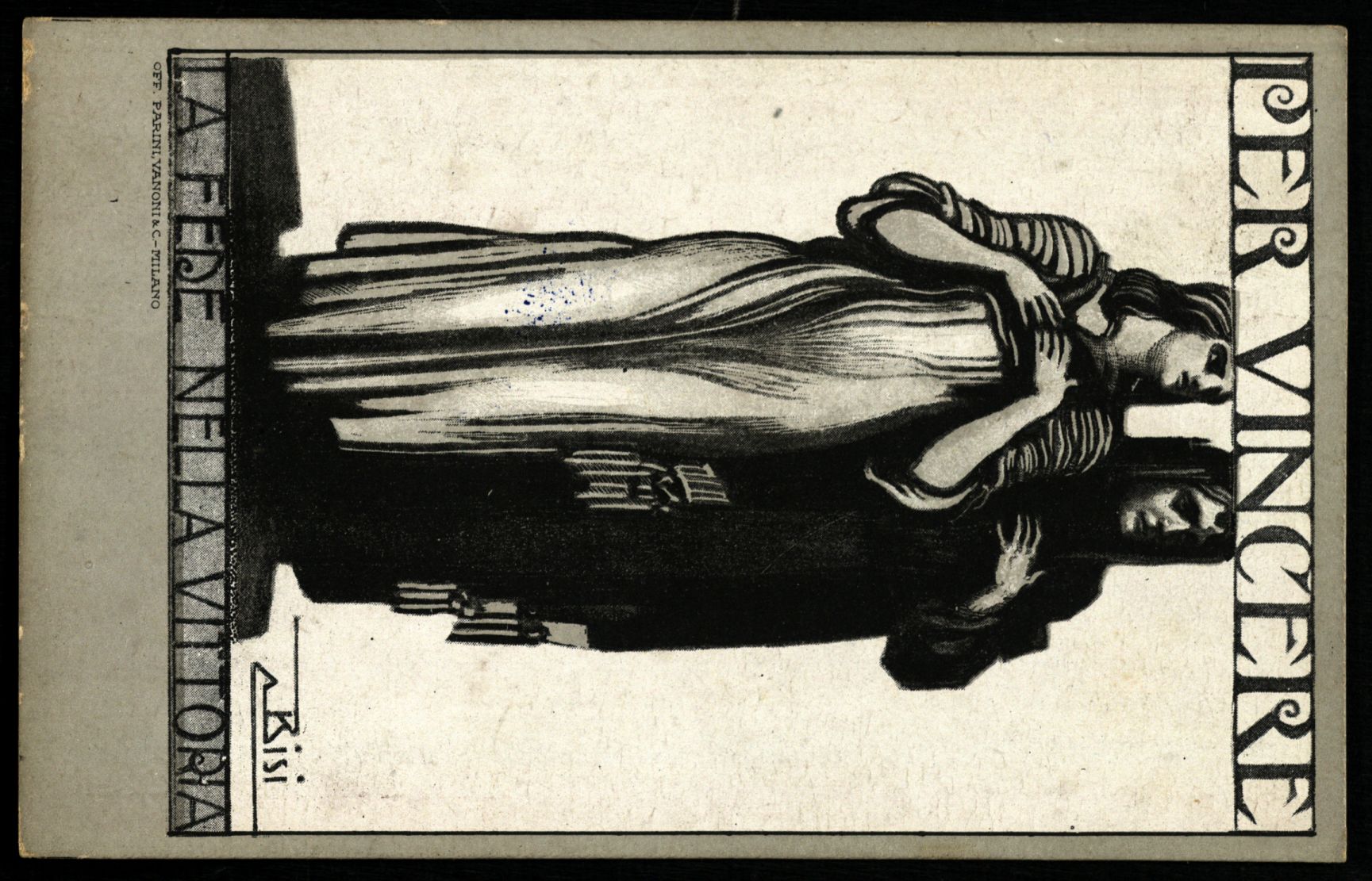 Due figure femminili, probabilmente madre e figlia, rappresentano l’Italia e il sacrifico che la Patria è disposta a dare per raggiungere la vittoria. Sul retro della cartolina: Propaganda artistica del comitato d’azione tra mutilati, invalidi e feriti di guerra.