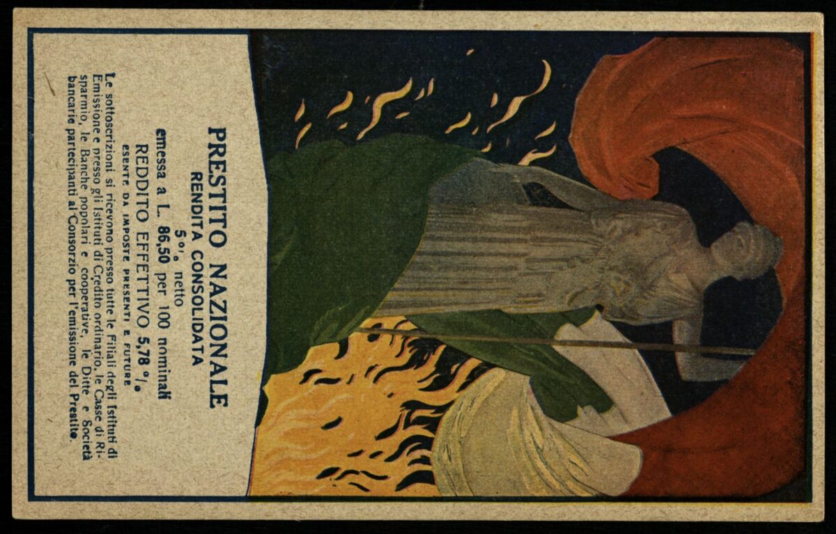 Allegoria dell’ Italia (Atena/Minerva) avvolta dalle fiamme e dalla bandiera italiana.