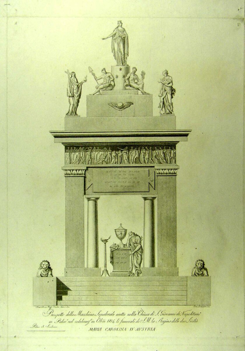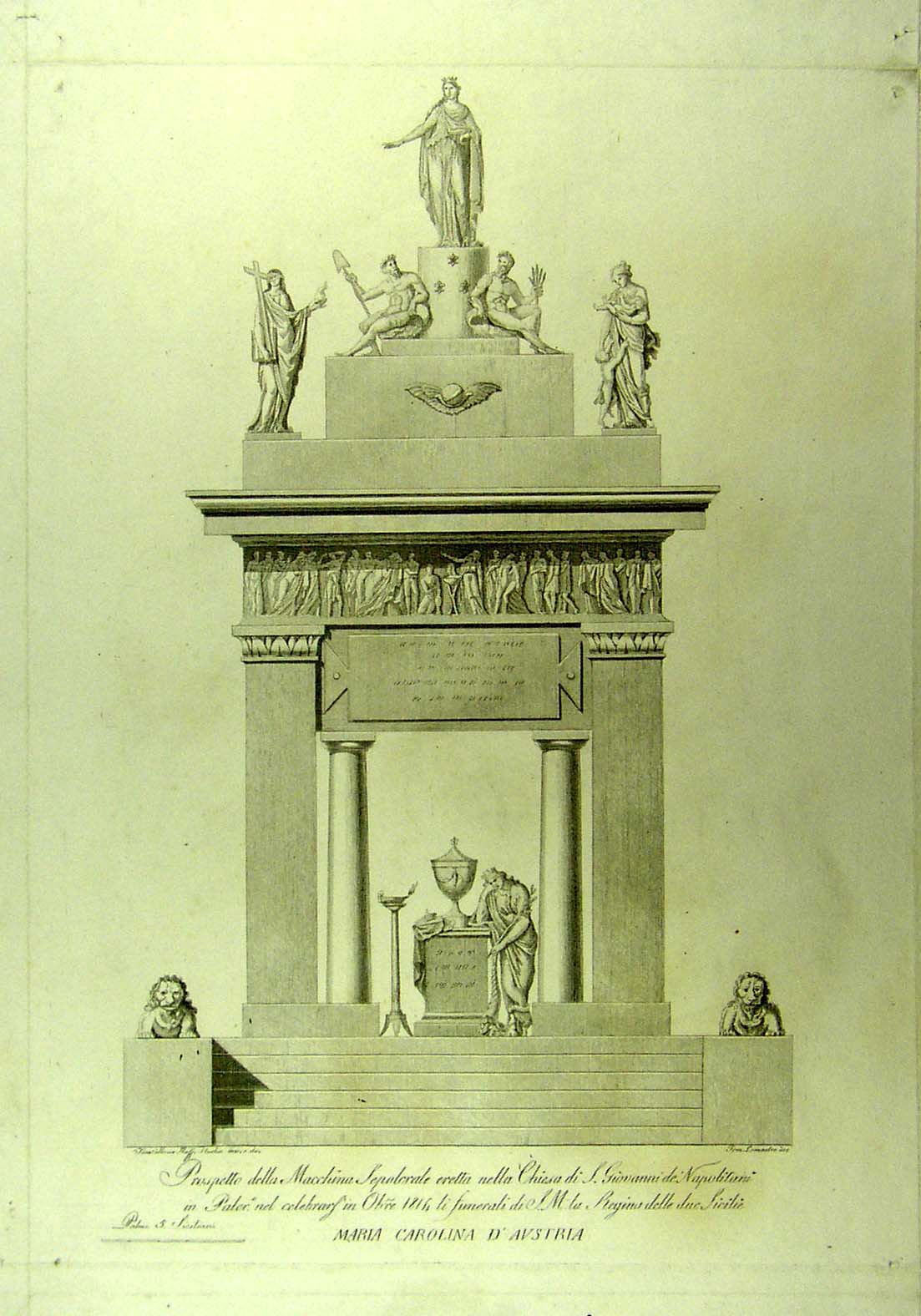 Il progetto della facciata del mausoleo in onore di Maria Carolina d’Austria da erigersi presso la chiesa di San Giovanni dei Napoletani a Palermo presenta al centro una figura femminile con corona turrita che piange sulla tomba della regina. In alto sono anche raffigurate l’allegoria della Religione (a sinistra) e dell’Abbondanza (a destra).