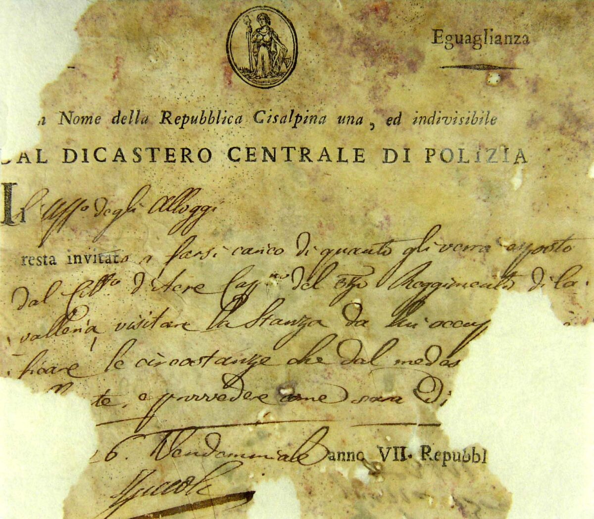 La figura femminile della Repubblica Cisalpina è rappresentata all’interno di un medaglione; tiene nella mano destra una picca, sulla cui sommità è posto un berretto frigio, e poggia la mano sinistra su un fascio littorio.