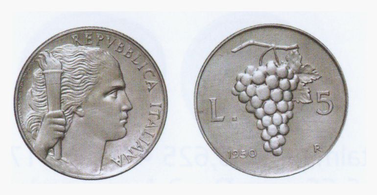 Emissione in italma; sulla parte anteriore della moneta è raffigurata la testa di Italia, la cui mano sinistra impugna una torcia.