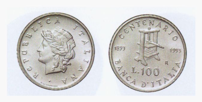 Emissione in argento; sulla parte anteriore della moneta è raffigurata l’Italia turrita, coronata di alloro. La moneta commemora il primo centenario della Banca d’Italia. La stessa immagine dell’Italia turrita si trova anche nelle monete commemorative del primo centenario della Banca d’Italia da 200 lire e da 500 lire.