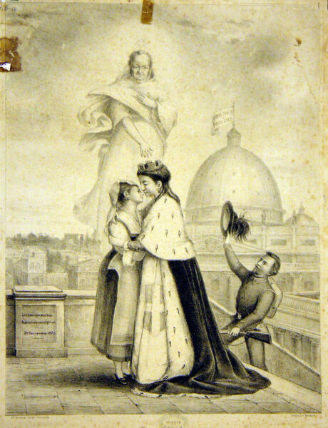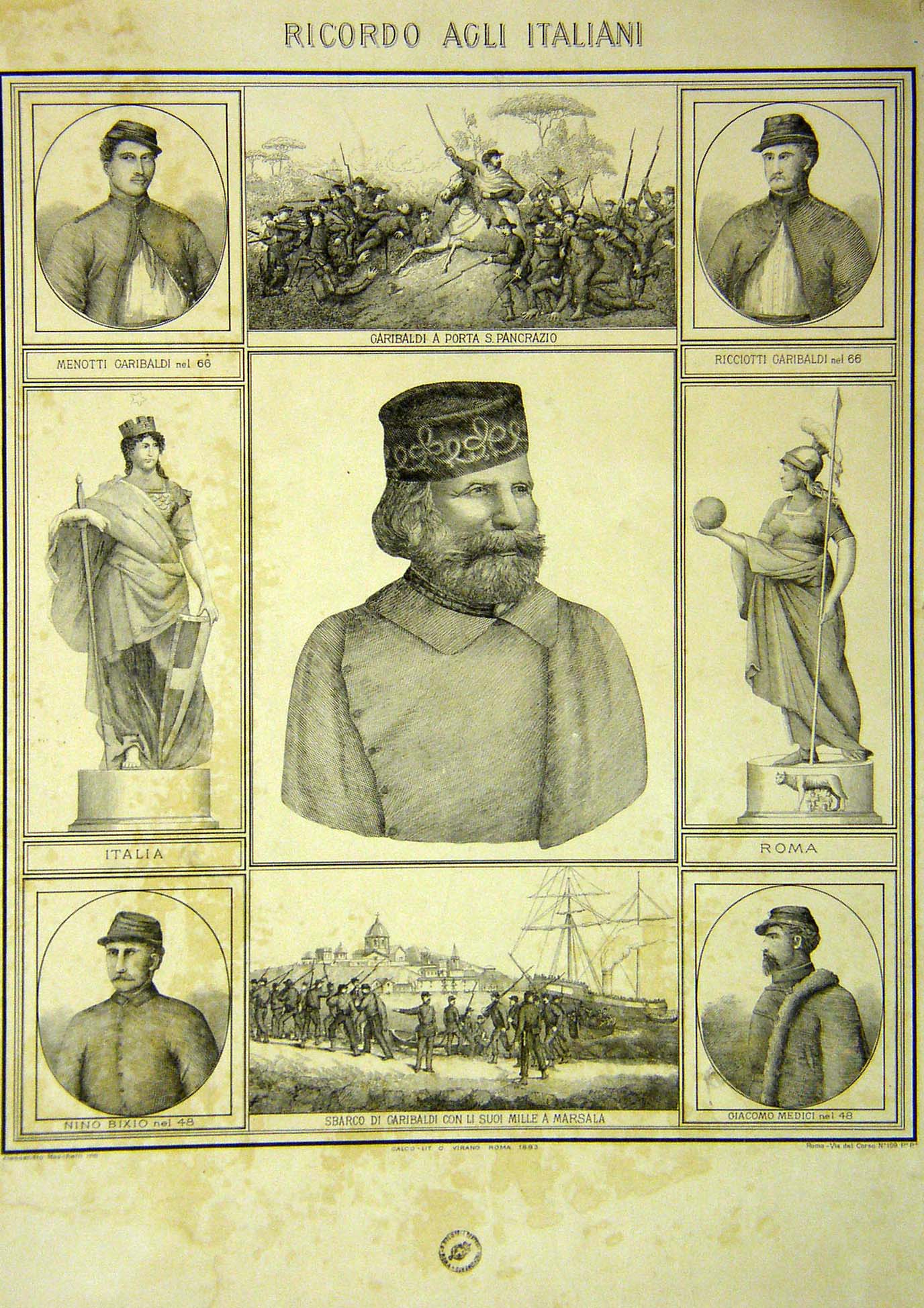 Garibaldi è al centro della rappresentazione. A sinistra è presente l’Italia turrita; questa indossa corazza e poggia la mano sinistra su uno scudo con stemma sabaudo e abbraccia una spada. A destra è raffigurata Roma, con elmo, lancia e globo.