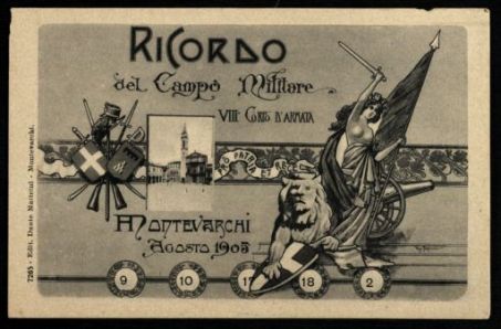 L’Italia turrita stringe nella mano destra una spada e nella sinistra il tricolore. Ai suoi piedi un leone e uno scudo con stemma sabaudo. Sullo sfondo la città di Montevarchi.