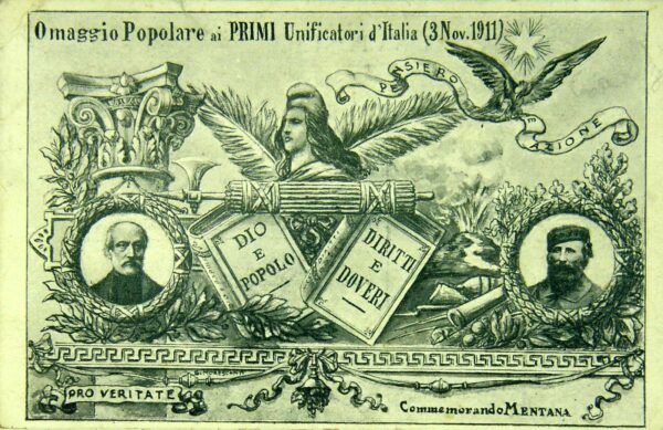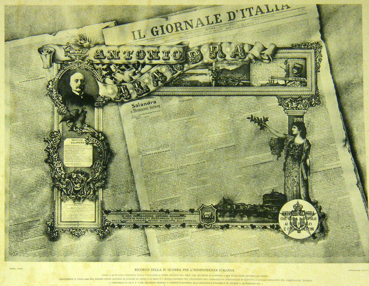 Sulla destra l’Italia turrita porge a Antonio Salandra un ramoscello di alloro.